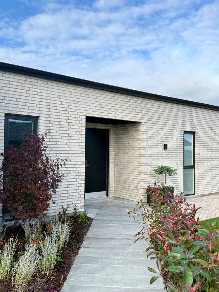 Allerede ved indgangen mærker man, at her er tænkt over tingene. Den overdækkede hoveddør tager imod jer og alle de ting, man ellers skal balancere med på én gang. Jakker, sko og tasker får et naturligt sted i entréen, som flyder videre ud i leverummene, hvor I kommer til at tilbringe det meste af tiden.