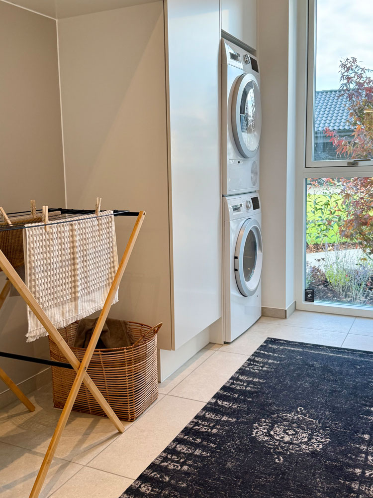 Bryggerset ligger praktisk i forbindelse med garagen og har både tørreplads og masser af opbevaring. Det er ikke nødvendigvis det rum, man taler mest om, men det er ofte her, hverdagen bliver nemmere.