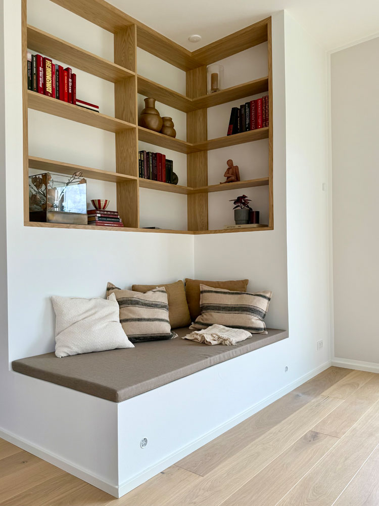 Stuen ligger lidt tilbagetrukket fra køkken-alrummet og giver jer mulighed for både fællesskab og fordybelse. Den indbyg-gede bogreol indbyder til læsehjørne, og placeringen gør det nemt at trække sig tilbage med – uanset om det er til ulve-time, middagslur eller bare en hyggestund.
