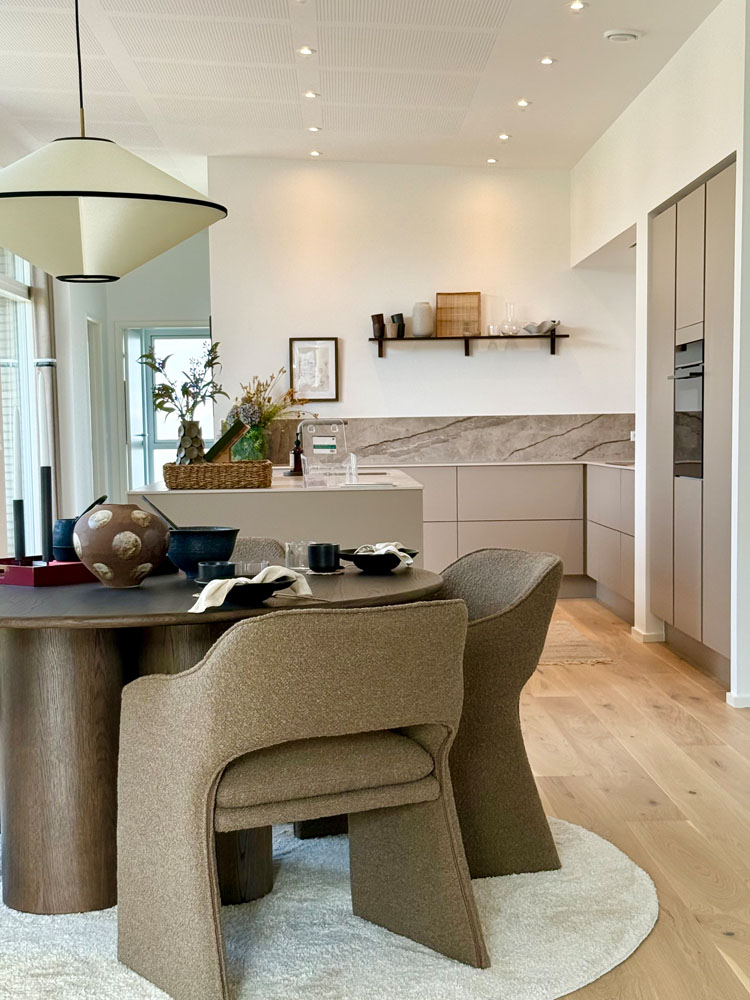 Køkkenet er oplagt, til hobbykokken der elsker at lave mad, eller bare gerne vil have plads til at være sammen, imens nogen laver det. Der er lækre detaljer som vinkøl, depotrum-met og lækre bordplader, men det handler i bund og grund om masser af bordplads. Plads til madlavning, til samtaler og til ro. Med direkte udgang til den overdækkede terrasse lige fra køkkenet, er det nemt at rykke maden med ud på træterrassen – også på de aftener, hvor duggen falder lidt tidligt.