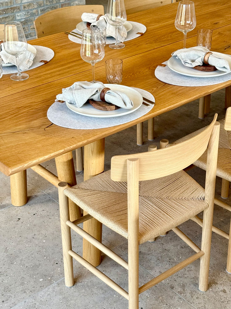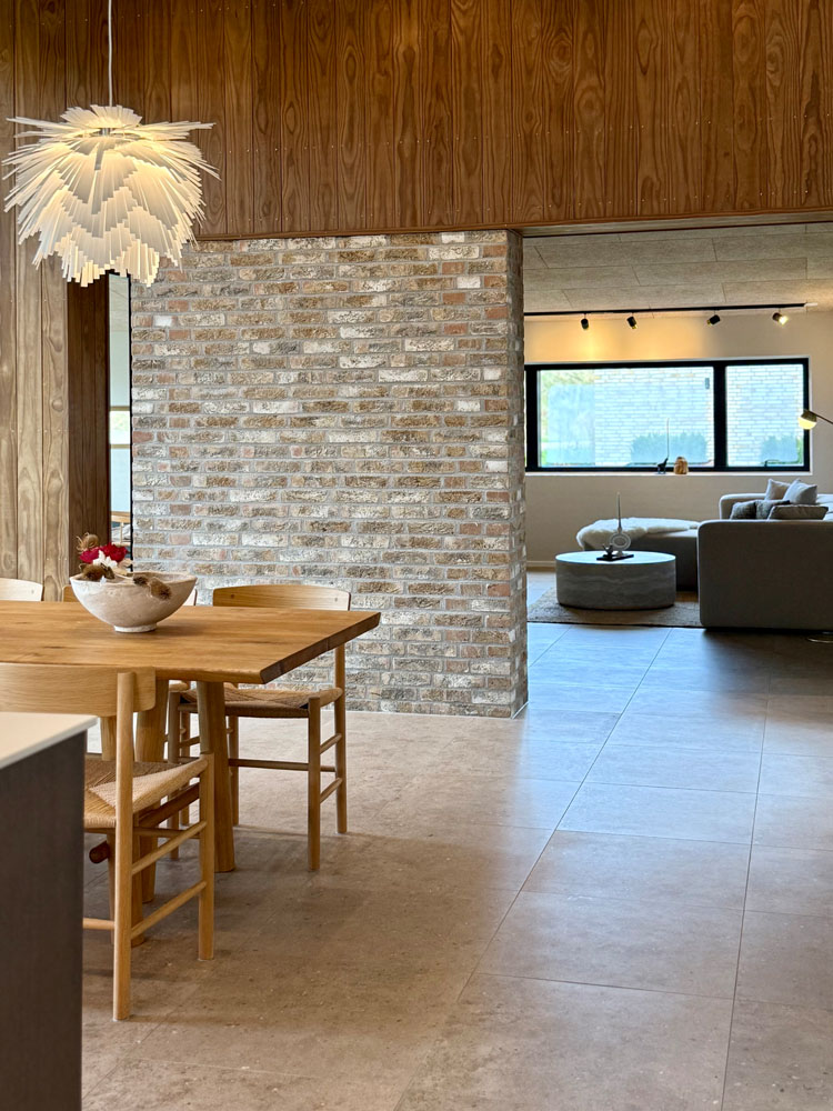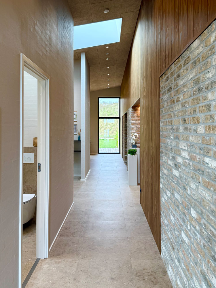I entréen har du direkte kig gennem huset til den vestvendte træterrasse – det føles åbent og indbydende. Funktionsgan-gen har en gennemgående træbeklædt væg i samme profil som udvendigt og er kombineret med markante detaljer i facadesten. Funktionsgangen rummer integreret kontor/ krea /opbevaringsplads med højt til loftet og lækkert lysind-fald fra et stort ovenlys.