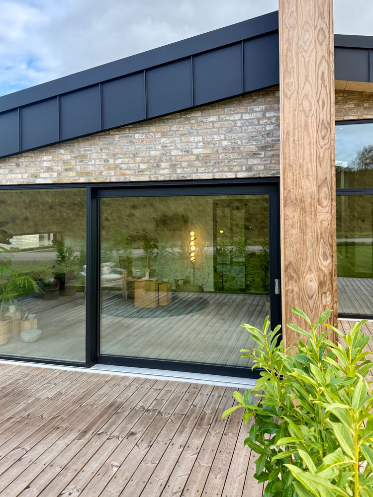Huset består af 201 m² veldisponeret bolig udført med høj finish og gennemtænkte løsninger. Hertil kommer en stor lækker udestue som emmer af æstetik og hygge. Huset er udført i en smuk kombination af træ og mursten med sort tag, sort alu-beklædning og sorte vinduer. Husets gennem-gående ryg giver bygningskroppen et interessant, helstøbt og anderledes udtryk.